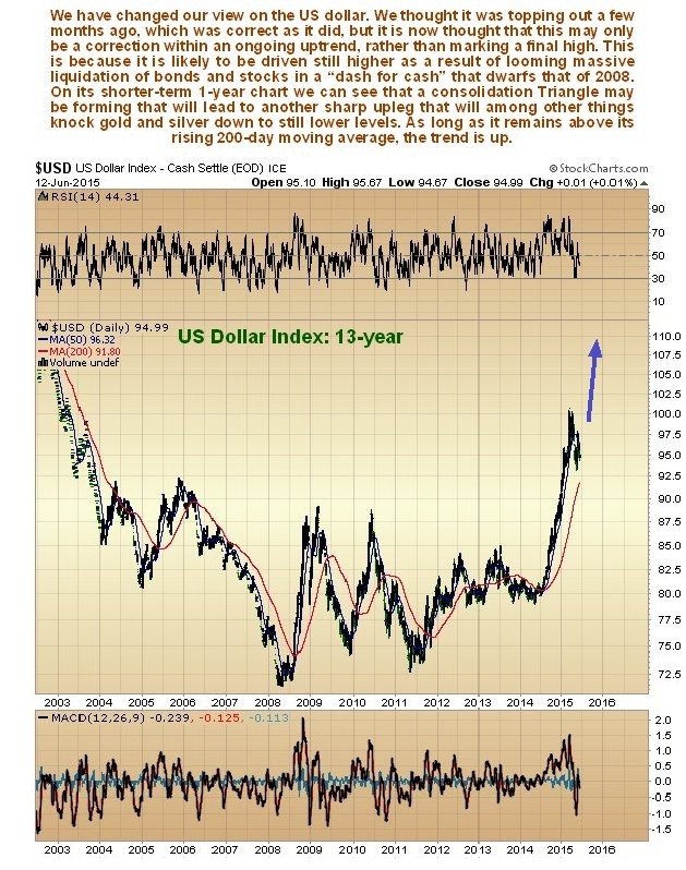 The US dollar is now at a very interesting juncture. In March its parabolic uptrend peaked and it burned out temporarily. At the time and soon after we had thought that it was done, and would go on to drop away, but given the prospect for a mass exodus from bonds and stocks, it looks set to become the beneficiary of a massive “dash for cash” that could drive another strong dollar rally. Technically, this is certainly possible as it is still above a rising 200-day moving average which means that arguably its trend is still up, and the reaction of recent months has allowed its earlier overbought condition to completely unwind.