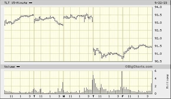 Below is a chart of last week’s price action for TLT (long-term U.S. Treasury bonds ETF)….