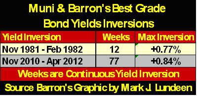 - In our current inversion, the first occurred in Barron's 23 August 2010 issue, but since Barron's 01 November 2010 issue, yields for muni-bonds have refused to decline below Barron's Best Grade Bonds - for seventy-seven continuous weeks!