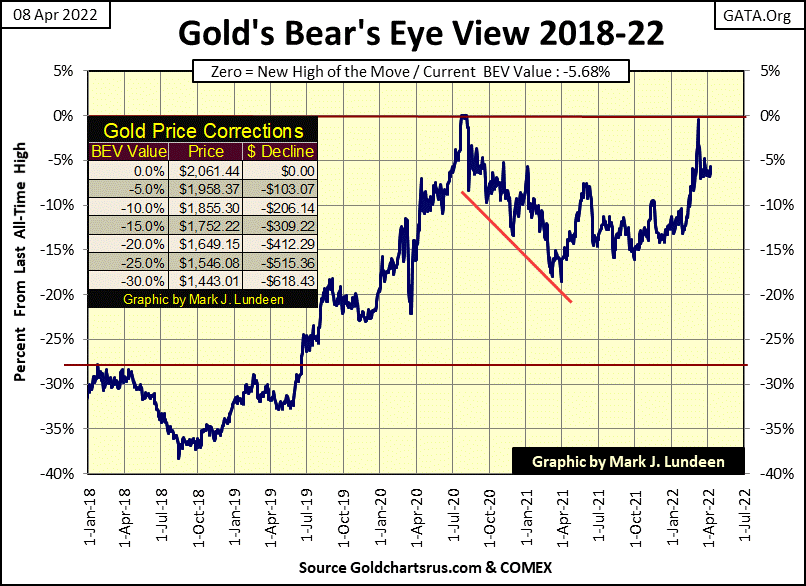 Here is something interesting; comparing gold’s and the Dow Jones’ BEV value at this week’s close. They are almost identical to each other, equally as far (or close) to making a new all-time high. Let’s see which will first print a BEV Zero (0.00%) in their tables below. One point to keep in mind. Gold has been trending down this past month, while the Dow Jones has been advancing. Could that make a difference? We’ll see.