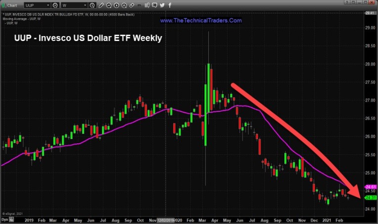 The Invesco US Dollar ETF, (UUP) Weekly below chart shows how weak the US Dollar has been after the COVID-19 price rotation. The continued decline in price levels after May 2020 is a very clear indication that the US Dollar is reacting to the continued stimulus efforts as well as the decreased economic expectations.