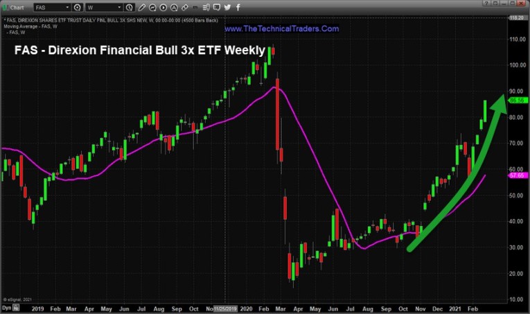 The following Direxion Financial Bull 3x ETF (FAS) Weekly chart shows the incredible advance in the Financial Sector over the past 6+ months. Almost like a sleepy rally, Financials have been rallying while traders have been focused on Technology, Healthcare and other sectors that seemed hot. This shifting trend in sectors, and the associated shifting capital, suggests we may be nearing a tidal shift in sector trends – moving away from Technology and into Financials, Energy, Real Estate, and others.