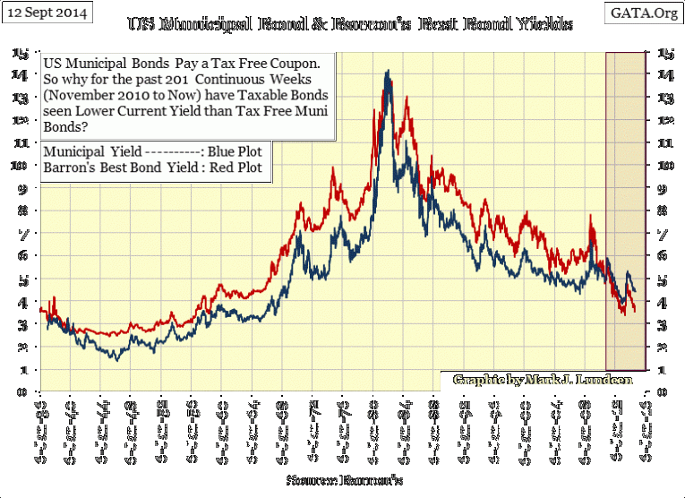 Though this is still true, muni-bond yields as published by Barron’s have been higher than yields for Barron’s Best Grade Bonds for 201 straight weeks (since November 2010, see red box in chart below). Although Barron’s has been publishing this data continuously since 1937, never in the past eight decades have the yields for tax free muni bonds been inverted for such an extended period.