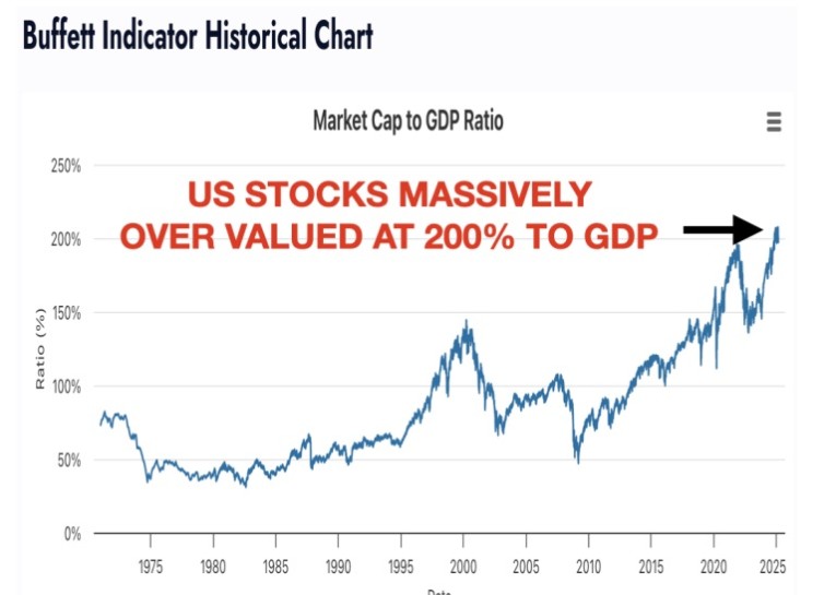 See the graph below of US Stocks to GDP. In the 2000 bubble top, Buffett’s indicator was “only”145%. That was when the Nasdaq fell 80%. Today, the US Stock-to-GDP is over 200%.