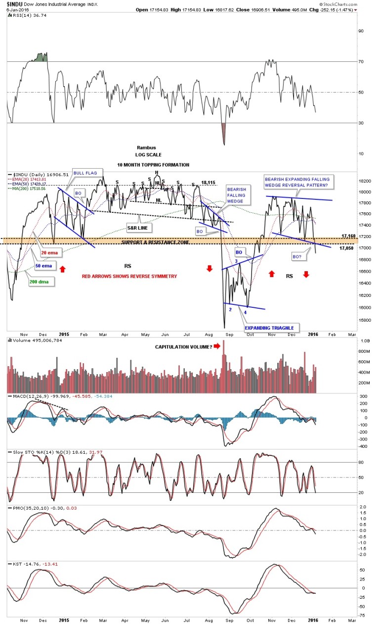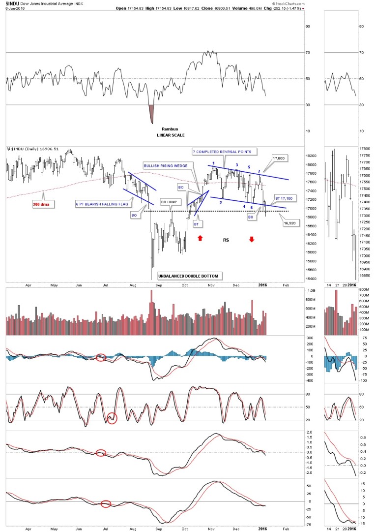 Today felt like an inflection point in gold and the DOW INDU with both breaking important trendlines. As there is a lot of ground to cover tonight let’s get right to the charts starting with the daily look at the DOW INDU. Today the INDU finally closed below the bottom rail of the now seven point bearish falling flag and the double bottom trendline at 16,920. This was a big deal IMHO. We may see a little backing and filling in this general area, but today’s move clearly setup a pattern of lower highs and lower lows. Note the six point bearish falling wedge that formed back in July of last year. As it formed below the previous high it needed an even number of reversal points to complete the pattern to the downside. Because our current seven point bearish falling flag formed at the top it needed to have an odd number of reversal points to make a reversal pattern. One last point on the chart below which shows two red arrows one point up and the other pointing down. As you can see the rally out of the low made in October was vertical only taking three days. The red arrow pointing down shows how it’s possible we may see the INDU reverse symmetry back down over the same area as shown by the red arrow pointing up.