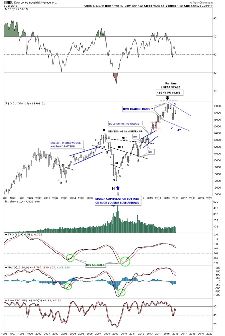 The monthly chart below shows what a possible big trading range might look like with the 3rd reversal point in progress to the downside right now.