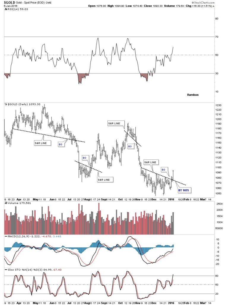 Next let’s look at a daily chart for gold which finally showed its hand today. This is just a simple bar chart which shows four support and resistance lines gold made over the last year or so. When you look at the S&R lines just think of the price action as bullish above and bearish below. After flirting with the recent S&R line over the last several days gold finally showed us it was ready to rumble on increasing volume. If we get a backtest to the S&R line it would come in around the 1075 area.