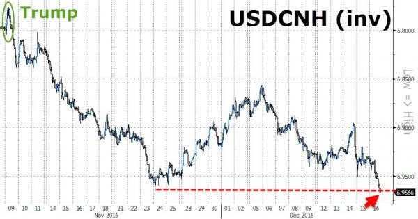 Following the December 16th devaluation and the Chinese seizing of the US underwater drone the offshore Yuan hit a fresh record low of Y6.96 against the Dollar. Since the "one-off" devaluation in Aug 2015, the Chinese currency has now weakened almost 14% against the dollar. And the chart shows that following the Trump effect more weakness is on the way not the least because of the rising debt/equity ratio, already at 250% for China, and the increasing amounts of money leaving the country in an accelerated fashion in anticipation of further Yuan weakness.