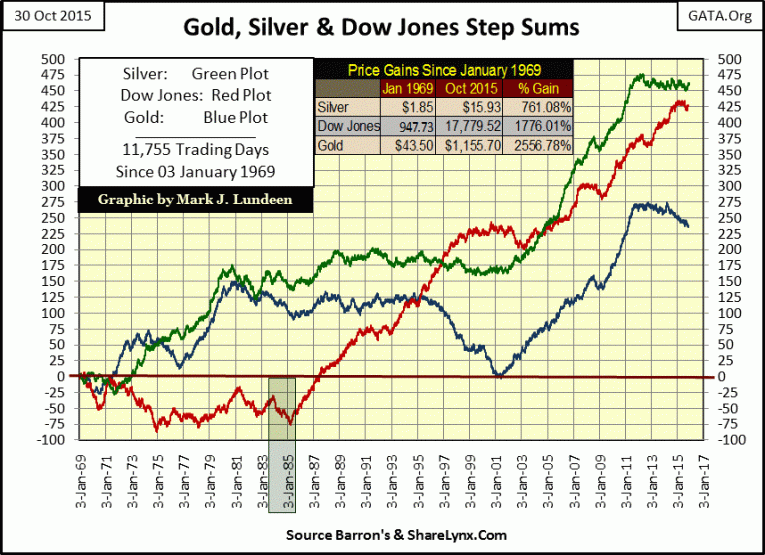 The chart below plots the step sums for gold, silver and the Dow Jones from 02 January 1969 to present. Interestingly silver (Green Plot) has seen the most net up days, yet since January 1969 its price has advanced the least. But that’s not really fair as silver is currently in a bear market, dropping 70% in price since April 2011. Just look at its step sum; four and a half years into a massive bear market yet its step sum still refuses to collapse. This is because after every down day in the silver market the bulls are back bidding up the price the next. Truth be told, these people are most likely the same ones buying it on the down days.