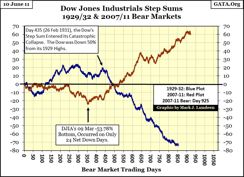 We see the different nature of market sentiment for the two bears. In the first half of the Great Depression bear, there were more up days than down, until investor sentiment saw its catastrophic collapse. Investor's sentiment for our bear market is amazing. No matter how badly Washington and Wall Street has screwed-up the economy with their toxic debt and derivatives, the public still believes the academics given air-time on CNBC, that that everything is well in hand. The Dow's 2007-11 step sum is telling us that the biggest bull market in 2011 is in forlorn hope!