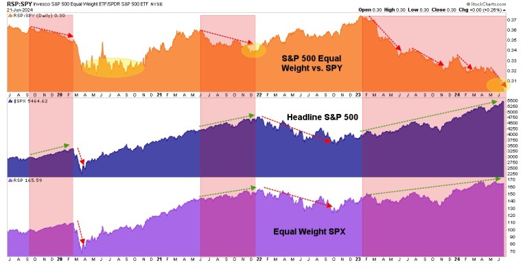 Now, let’s take it a step further. You may recall that the fact that RSP/SPY was rising during the supposed bear market of 2022 aided our view that it was not a real bear market but rather, an extended correction. RSP/SPY was a positive breadth underpinning. So for the sake of integrity, you need to know that I will call what I see, not what my dogma sees.