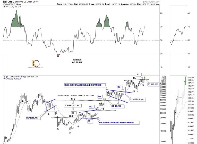 So far, we’ve looked at the nearly four-year H&S consolidation pattern, as shown on the daily combo chart above, and the 2020 blue bullish expanding falling wedge. This next monthly combo chart combines the 2023 H&S consolidation pattern and the 2020 blue bullish expanding falling wedge into one consolidation pattern, which is a very powerful setup.