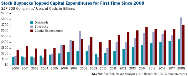 Thanks to corporate tax reform, stock buybacks also shot up to an all-time high of more than $800 billion in 2018. For the first time since 2008, this amount topped what S&P companies spent to replace or upgrade offices and equipment.