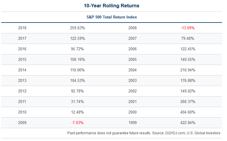 According to Marc, only two out of the past 20 years—2008 and 2009—were losers for the 10-year period with dividends reinvested, thanks to the financial crisis. And that’s only if you had cashed out at the worst possible time. Even the tech bubble of the late 1990s and early 2000s wasn’t enough to prevent most investors from losing their principal investments made a decade earlier.