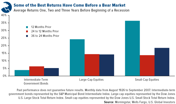 If you believe that a recession or bear market will strike later this year or next, it still might not be time to get out of stocks altogether. That’s because returns have tended to be strongest 12 months or so before the start of a recession, as opposed to two or three years before.