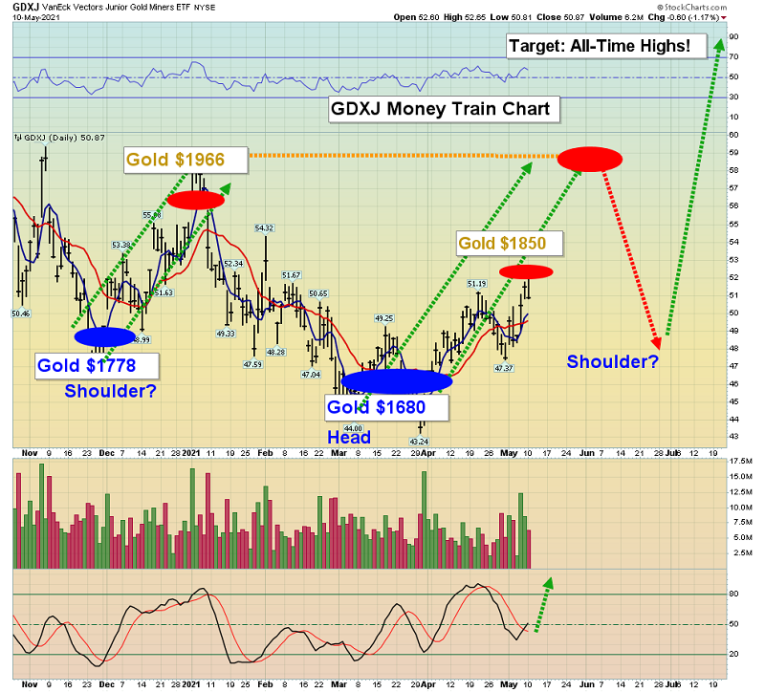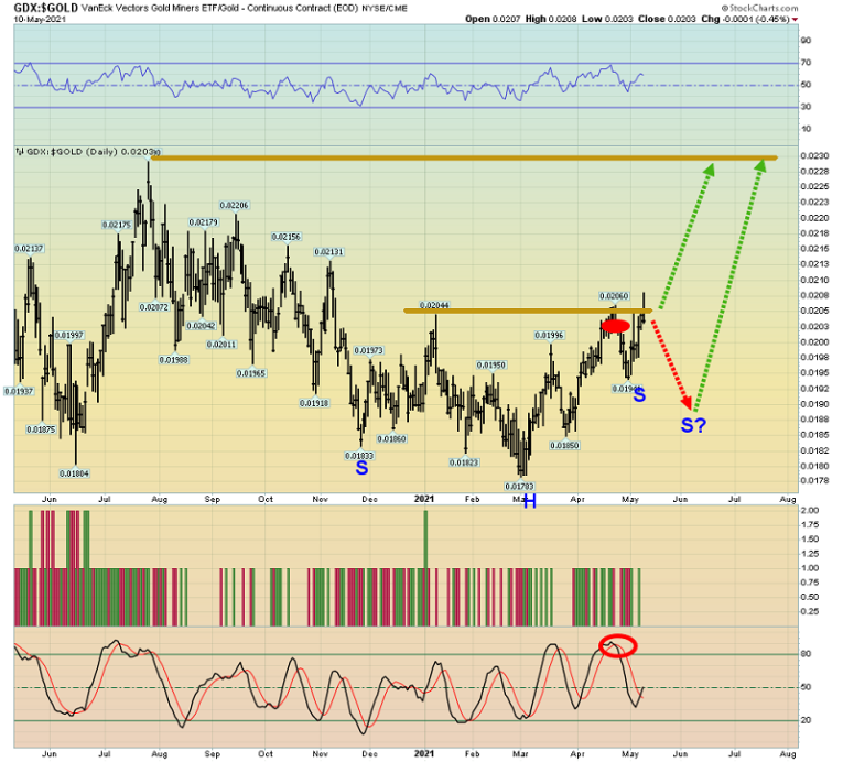 The important GDX versus gold ratio chart. A beautiful inverse H&S bottom is in play. A pullback would only add to the aesthetics of the pattern… and to the potential upside target price!