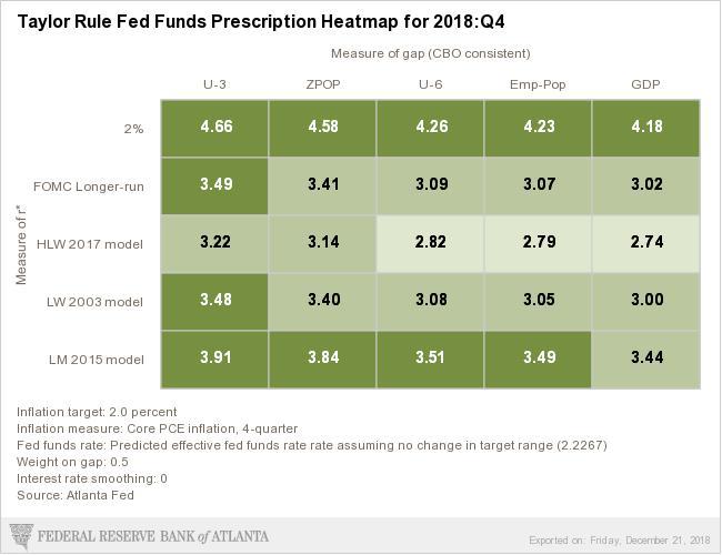 However, it’s a strange statement. We, of course, do not know what models Powell uses. But please take a look at the heat-map of the Taylor rule prescriptions for the federal funds rate below. It was prepared by the Atlanta Fed.