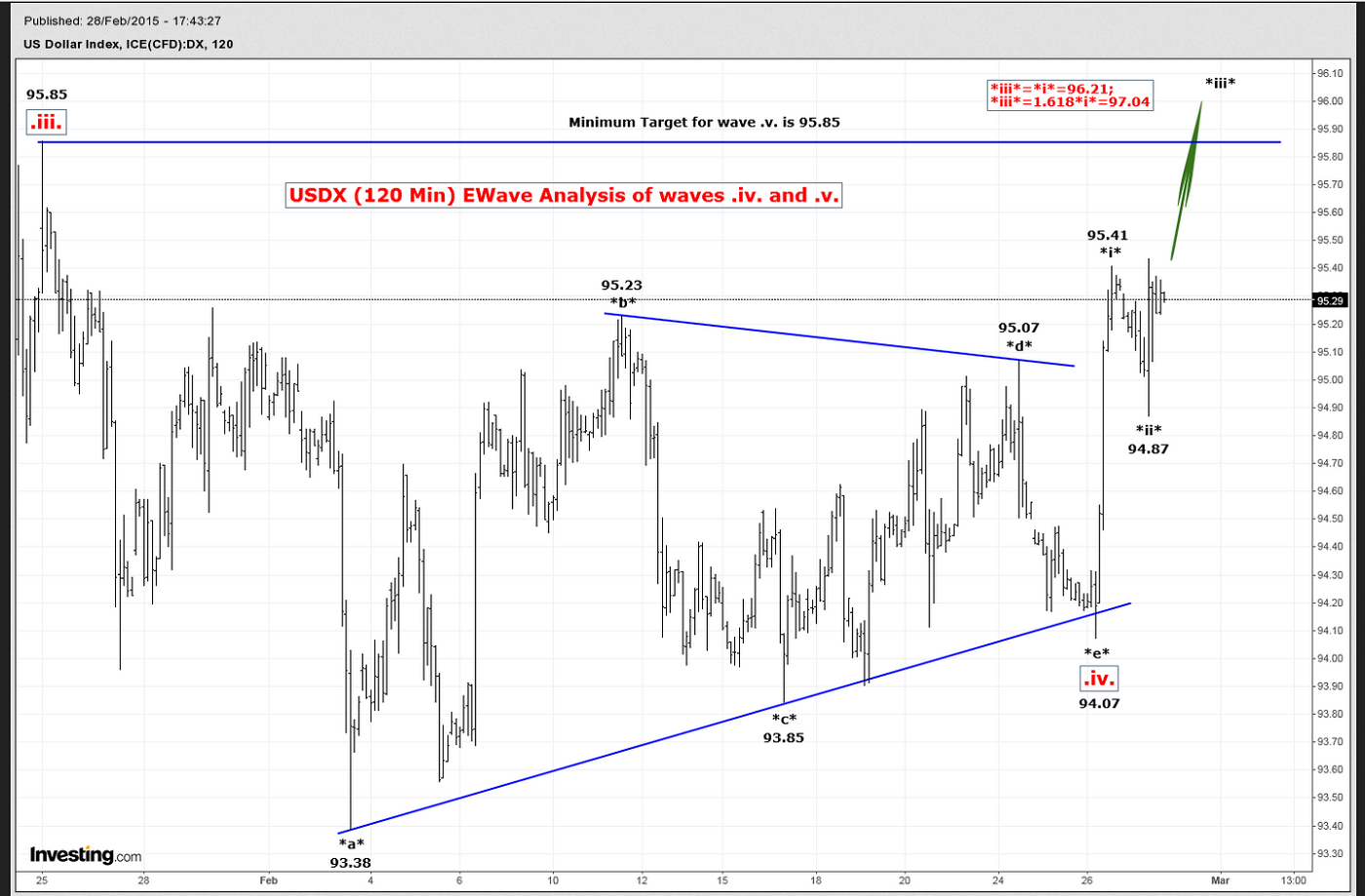 The USDX complete our wave .iv. triangle this week, pretty much as we expected at 94.07 and we are now rallying in our wave .v. thrust to at least the wave .v. high of 95.85.