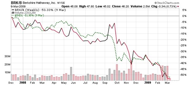- Buffett’s Berkshire Hathaway stock dropped -53% in the 2007-2008 correction, while the Dow Index fell -52%...and he fervently desires to avoid the same miscalculation this time around. See the 2007-2008 Stock Market Crash results: