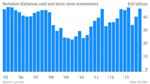 Warren Buffett's Berkshire Hathaway’s cash hoard has surged 30% to nearly $50 billion since the end of 2011.