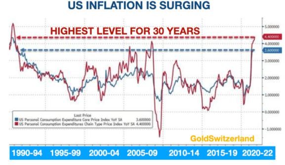 Hmmm! The Fed’s favourite inflation indicator, the PCE Deflator (see graph below) is at a 30 year high. Since the Treasury or the Fed are never correct in any prediction, how can they now believe with inflation tuning to the highest in 30 years, that this is transitory.
