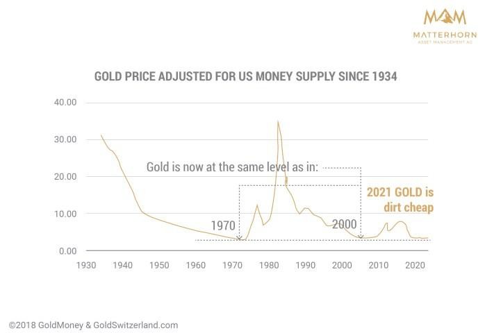 Finally, the graph below proves that gold in relation to US money supply is as cheap as in 1970 and in 2000. Please don’t ignore the opportunity of a lifetime to both preserve your wealth and own an asset with a substantial wealth enhancement opportunity. Buy gold.