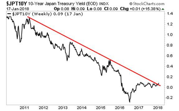 Even Japan’s sovereign bonds are coming into the “inflationary” crosshairs with yields on the 10-Year Japanese Government Bond just beginning to break about their long-term downtrend.