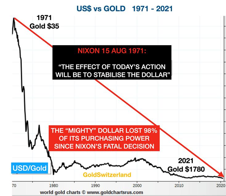 Nixon for example believed that he committed a good deed and stabilized the dollar. If he is looking down from above, he will now 50 years later, see that his actions have created a “mere” 98% fall so far.