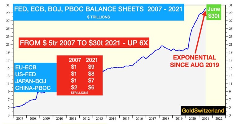 As the graph shows, since the Great Financial Crisis started in 2006, the balance sheets of the four biggest central banks have gone up 6X. Since the current crisis accelerated in 2019, the growth is now EXPLOSIVE!