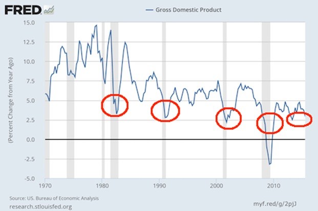 As you can see, the “recovery” of the last six years has largely involved a “growth” rate that was closely associated with recessions over the last 30 years. At best the US economy has been flat-lining. At worst we’ve had bouts of economic collapse comparable to a recession.
