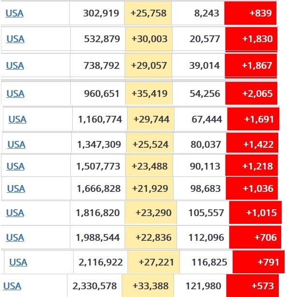 The charts above of daily new cases and deaths in the US show the new spike as well as the declining trend in mortality. It is interesting that deaths occur in a near weekly cycle; 2 to 3 days of relatively few deaths and 5 to 4 days of high mortality. The decline in mortality is likely to be due to both better treatment regimens and, probably, vulnerable people taking better care not to get infected. A reason for the cycle is not evident, but could be linked to a life style of more social contact during five weekdays and a weekend spent in more isolation. It is, whatever the cause, a surprisingly consistent cyclic pattern.