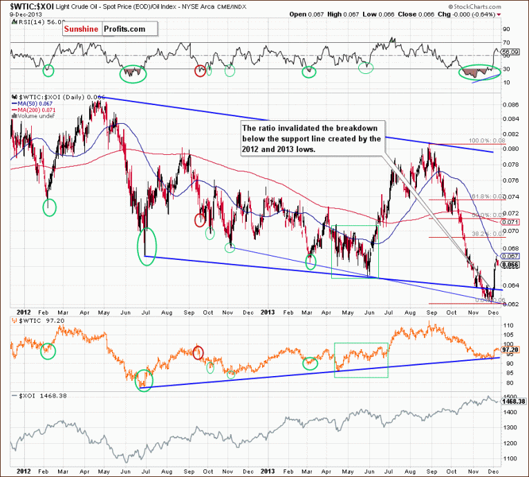 Looking at the above chart, we see that the ratio reached the 38.2% Fibonacci retracement level (based on the entire 2009-2011 decline) and invalidated a small breakout above this strong resistance level, which was a bearish signal. This circumstance triggered a downswing, which took the ratio to the lower line of the gap between the April 2009 low and May 2009 high (marked with the red rectangle), which is not supporting further growth. From this perspective, the implications for oil are bullish.