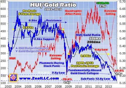 I certainly understand the brutal psychological pressure this year’s extreme selling has exerted on gold-stock investors. As of this week, the HUI is down 50.6% year-to-date thanks to gold’s own 22.0% loss. And it wasn’t like gold stocks were expensive before 2013’s wildly-unprecedented GLD mass exodus and gold-futures forced liquidations triggered by the Fed’s stock-market levitation arrived, they were cheap then too.