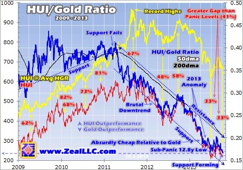 Today’s smug gold-stock bears foolishly ignore market history, they make the assumption that gold stocks (and gold for that matter) will continue falling deeper out of investor favor forever. But this flies in the face of the indisputable truth that markets are cyclical. The HGR has been plunging almost without respite for over 2 years now, since early 2011. At some point this will reverse, gold stocks will start reflecting fundamentals.