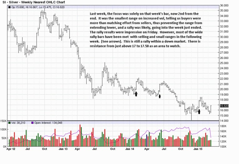 Patterns repeat, over and over, which is why the arrows show how prior wide range rally bars in a down market led to immediate resistance and sellers resuming control. It remains to be seen of the November ’14 spike low becomes a bottom. For now, there is not sufficient confirmation.