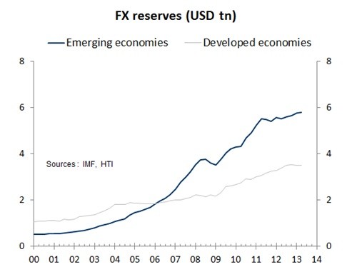 Central banks of emerging economies accumulated sizable foreign exchange reserves after the Asian financial crisis in 1997. Total foreign exchange reserves of emerging economies reached $5.8 trillion by the end of June in 2013, up from $523 billion by 2000, and their percentage of world total FX reserves rose to 50.2 percent from 27.5 percent in the same period, according to data from the International Monetary Fund (IMF).
