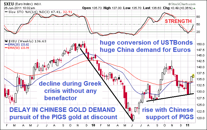 Something unique and unusual has happened in the last three weeks. The Euro currency has risen noticeably from 129 to 137, but the Gold price has fallen from $1385 to $1335 per ounce. For almost a full decade, the correlation between the US$ DX index and the Gold price has been in the minus 70% neighborhood. What has happened in the last month has been a gigantic outlier. It is not just significant with umpteen standard deviations above the norm. It is in the wrong direction. My best guess is that the Chinese have temporarily halted their usage of the COMEX avenue for gold acquisition. They have permitted the corrupted COMEX to push down the gold price, using its fraudulent paper mechanisms. They have given free rein for the Wall Street maestros to lower the gold price for any IMF deal to secure European gold bullion in exchange for EuroBonds. Most gold & silver contracts are settled in cash anyway these days, since the COMEX does not have much precious metal in its possession. Imagine the day coming before too many months when gold & silver can be traded in contracts at the COMEX with no gold or silver metal exchanging hands. That day is coming, along with ruin of the GLD and SLV defaults, ruin, deep discounts in share price versus the metal price, and investor lawsuits. As for the Gold & Silver price, they will rise when the Chinese decide to resume buying. Right now, their attention is diverted to EU gold bought at deep discount, and in volume. As usual, they are thinking at least 20 years ahead. The Gold & Silver price will rise soon enough for the patient minded. The physical market wrests control always, as the mid-term forces take over.