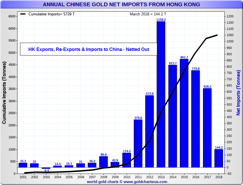 According to Hong Kong’s Census and Statistics Department (HKCSD), Hong Kong net-exported 144.2 tonnes of gold to mainland China during the first 3 months of 2018. Extrapolating this on a 6 months basis would be about 290 tonnes, and 580 tonnes on an annualised basis. This would be a 7.5% drop compared to 2017 full year net gold exports from Hong Kong to China, but such a drop is to be expected as there is a trend of China is now engaged in more direct gold imports from destinations other than Hong Kong.
