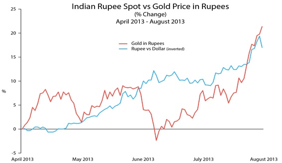Whilst under normal circumstance gold demand and the gold price measures in rupees enjoy a high price elasticity I believe that people are now trying to hedge themselves for the weakness in the economy and the vulnerable outlook for the rupee. The Indian government concern is that its citizens are exchanging their rupees for gold in droves, which is exacerbating the slide in the rupee because rupees are offered in exchange for dollars needed to buy gold. Demand for gold in India is being partly met through unofficial channels such as smuggling. Indians are bringing in gold through neighboring countries, such as Pakistan, Nepal, and Sri Lanka, pushing their imports sharply higher as well and prompting action by their governments. In an attempt to address steep devaluation of the rupee against the dollar, Pakistan recently temporarily banned import of gold to save the precious foreign currency reserves.