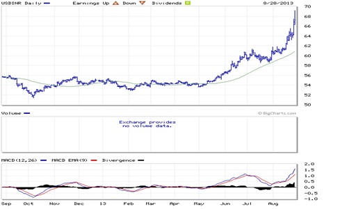 On Wednesday August 28, the Indian rupee hit a fresh record low against the U.S. dollar, as efforts by Prime Minister Manmohan Singh to calm investors failed to prevent further selling. The Indian currency traded at 69.1 rupees against the dollar, according to FactSet, marking an almost 20% decline on the year. The weakness in the rupee comes amid increasing worries about how India will adapt to tighter global monetary policy, especially in anticipation of the Fed’s tapering.