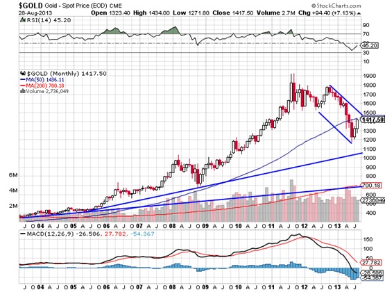 As with all the other hard commodities where China accounts for some 40% of sales, China is now also becoming the dominant swing factor in the gold trade ( i.e. physical gold (the only real gold…paper gold is no gold!). On August 12 the China Gold Association (CGA) announced that China's consumption of gold in the first six months of 2013 surged to 706 tonnes, up 54% from 460 tonnes in the first half of 2012, as strongly declining prices of the metal lured buyers. Investors rely on data from trade groups such as the CGA and import custom numbers from Hong Kong - a key supplier to China - to forecast demand. The CGA also said output in China, the world's biggest gold producer, reached 193 tonnes in the first half, up 9% from a year ago.