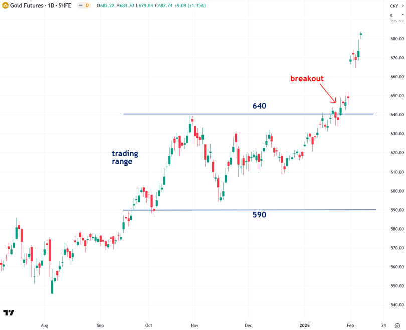 The trading range and recent breakout are also evident in the international spot gold price denominated in Chinese yuan, providing further confirmation of the bullish trend: