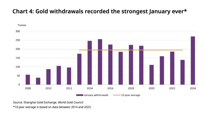 Gold withdrawals from the Shanghai Gold Exchange (SGE) hit 271 tons in January, the highest level on record. It was a 95 percent increase compared to a tepid 2023 and a 65 percent increase month-on-month.