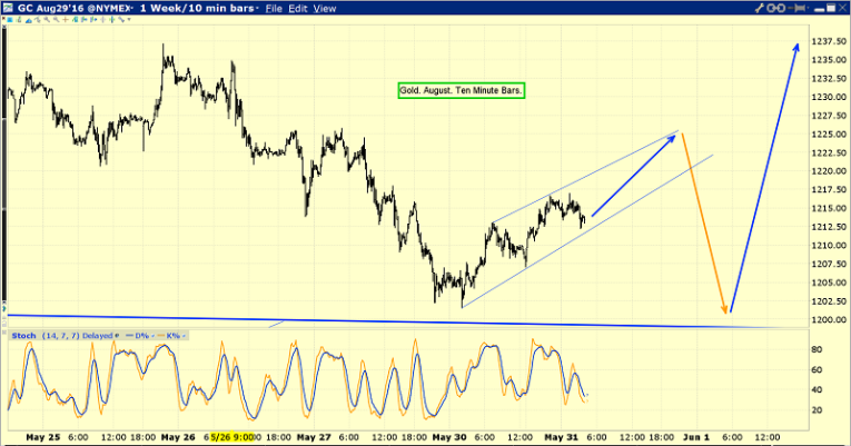 This short-term chart shows gold beginning a small uptrend, with higher lows and higher highs.