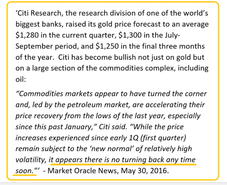 Powerful JP Morgan analysts have forecast gold will surge to $1400 in the second half of 2016. Furthermore, Citi recently voiced a nice price forecast.