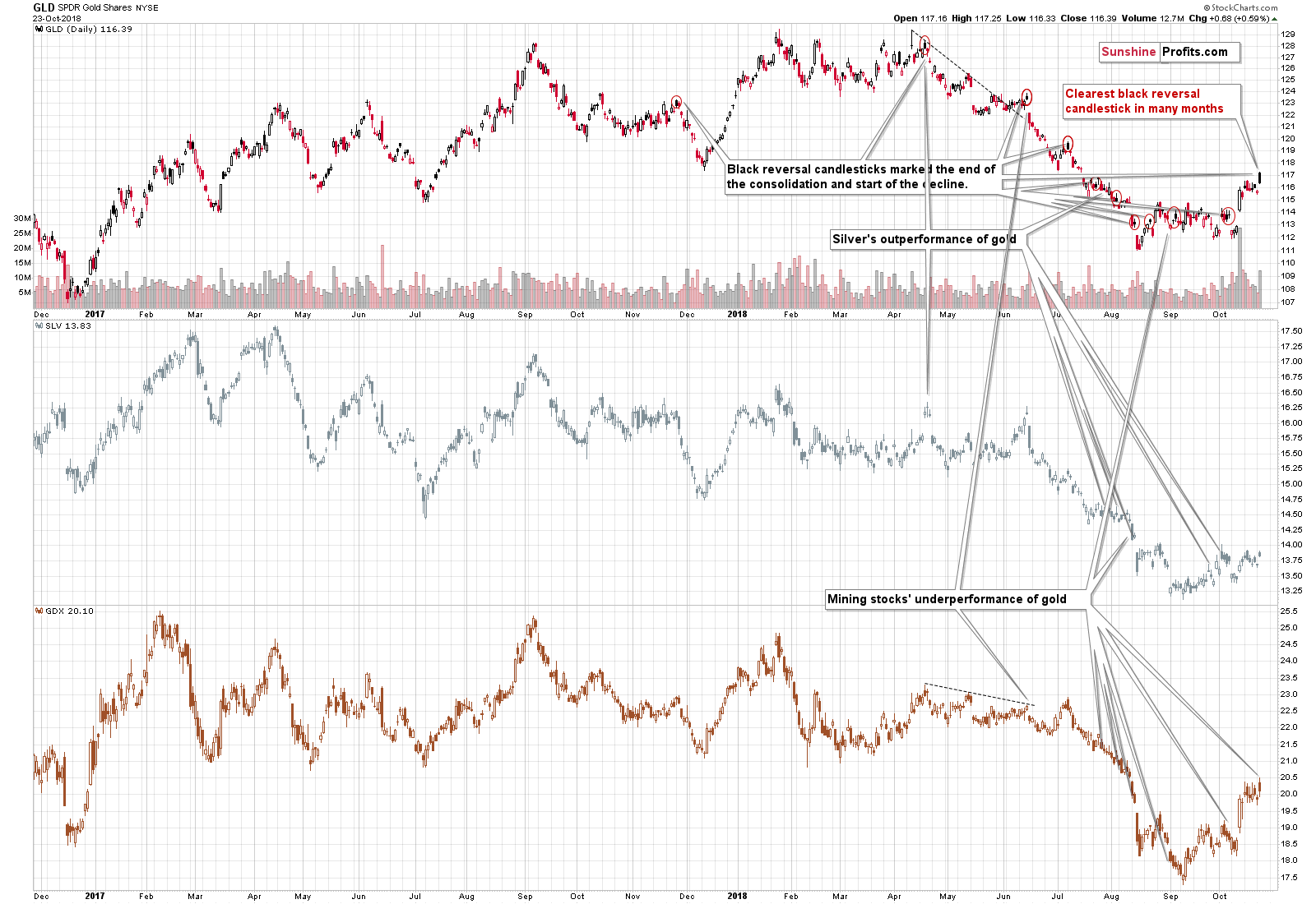 Gold, silver, and mining stocks all ended yesterday’s session higher, but at the same time, they all declined on an intraday basis, during the US session. This is particularly visible in case of the GLD ETF, where we see a clearly visible black reversal candlestick (in terms of spot or futures prices, many black reversals in GLD correspond to gold shooting stars). In fact, that’s the clearest black reversal that we’ve seen in many months. There’s not one case on the above chart where the signal would be more apparent.