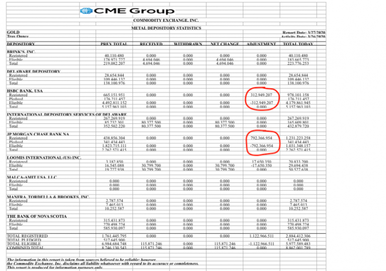 Note, too, that ScotiaBank was also forced to make delivery from their House Account of 235,100 ounces or about 8 metric tonnes. And note that, so far, HSBC has not posted a single delivery. But they're next. How do we know this? Check this massive, unprecedented re-allocation of gold from eligible to registered that took place late last week. JPM took the steps necessary to deliver 7,923 Apr20 contracts, while HSBC looks to have prepared for 3,129.