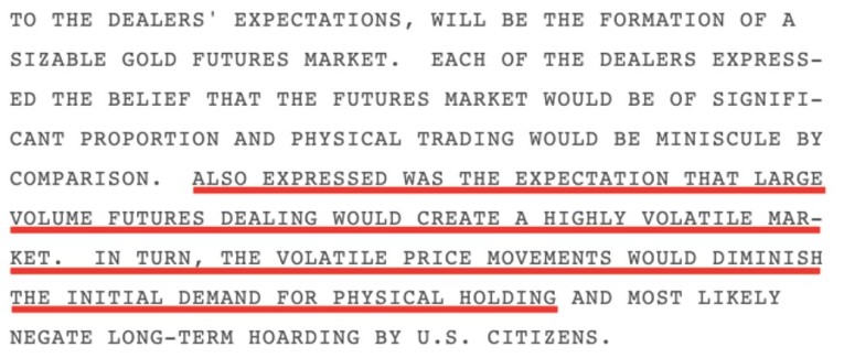 Remember, precious metals futures contracts were explicitly designed to draw interest away from the ownership of physical metal. Additionally, the "expectation was that large volume futures trading would create a highly volatile market" that would scare off large scale physical investment. See for yourself in this cable dated 12/10/74—three weeks before gold futures began trading on 1/1/75: https://wikileaks.org/plusd/cables/1974LONDON16154_b.html