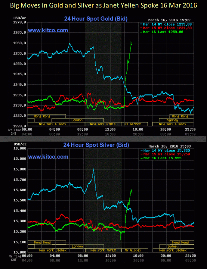 Gold and silver markets showed serious disrespect to Fed Chair Janet Yellen while she was speaking on “monetary policy” Wednesday on CNBC. I couldn’t say exactly what happened, but I liked it.