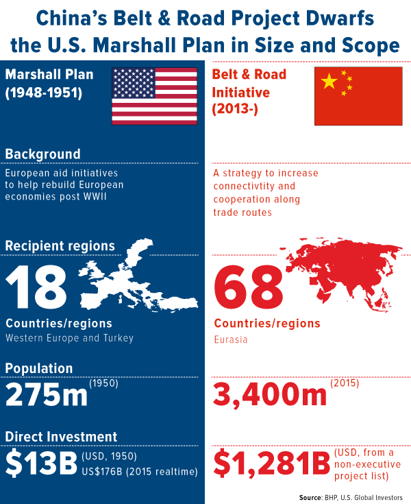 To give you some scale as to how monumental and historic this undertaking truly is, the graphic below, courtesy of BHP, compares the development to the U.S. Marshall Plan, then one of the most expensive projects in human history. The Belt and Road initiative could eventually cost 12 times as much or more, with total spending estimates ranging between $4 trillion and $8 trillion.